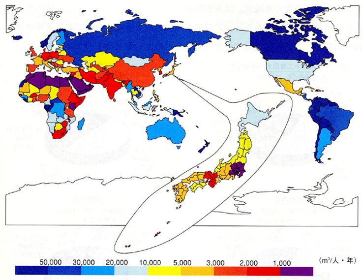 国土交通省水資源部編「平成16年版 日本の水資源」によると、日本は、降水量は多いものの水資源には恵まれていない。図2を参照すると驚かれると思うが、人口当たりの水資源で比較すると、関東は北アフリカや中東と同程度の水資源賦存量である。