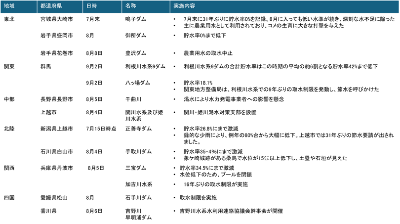 2025年の渇水は、夏に顕著に現れた。前述の「空梅雨」が原因と推察されるが、新潟県上越市や兵庫県加古川市で節水要請や取水制限が実施されるなど、記録的な渇水が発生したことを読者も記憶されているであろう。また、多くのダムで貯水量が低下し、取水制限が検討された。弊社で整理した各地域の渇水の事象を表4に示す。