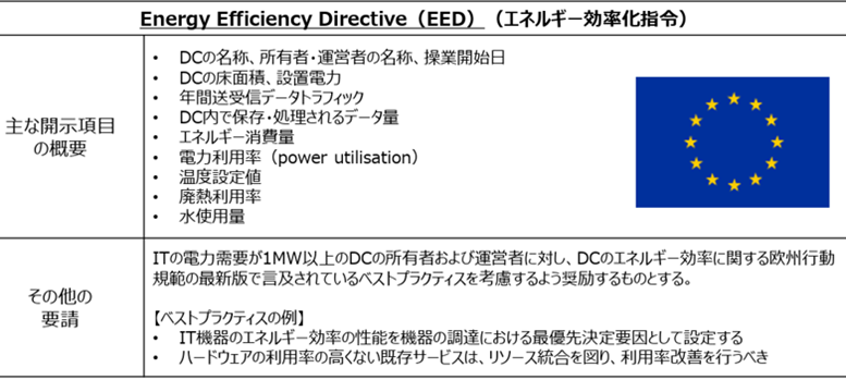欧州では、欧州委員会が「Energy Efficiency Directive」でデータセンターの効率改善に向けた取り組みを推進している。同司令では、欧州自国内に立地する500kW以上のデータセンター所有者泳ぎ運営者に対し、エネルギー使用量や水使用量などの資源の利用効率の実績について開示を求めている。図6に経済産業省が整理している情報を引用する。