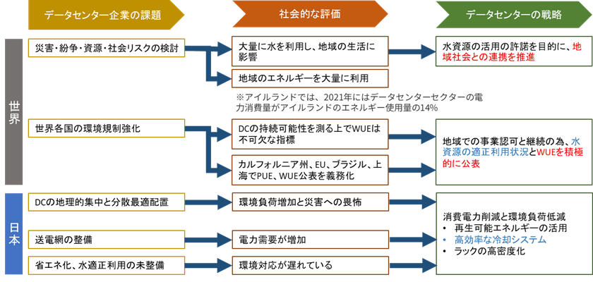 政府はこのようにデータセンターの建設において、積極的に電力の有効利用を推進しているのであるが、水の有効利用については政策を設けていない。データセンターでは、サーバーなどの機器が稼働する際に発生する大量の熱が出る。コンテナ型のデータセンターでは40度近い環境を冷却するために20度の空気が必要となる。従い、機器の性能低下や故障を防ぐための冷却が求められる。各データセンターでは空調設備において、空冷と水冷を、また、最近では絶縁性(電気を通さない性質)の液体にサーバー本体を丸ごと浸し、チップを直接冷媒に触れさせることで効果的にサーバーを冷却する「液浸冷却技術」の導入を検討しているデータセンターもあるが未だ数例であり、殆どのデータセンターで空冷と水冷の空調を適用している。空冷技術は水を殆ど利用しないが、電力消費が大きく、水冷技術は水での熱交換を利用することで電力消費を軽減させる技術になる。日本では空冷技術を活用しているデータセンターが多く、今後は水冷技術を検討していくデータセンターが増えていくであろう。ここで問題となるのが、地域の水資源を大量に使う恐れと、他セクター及び地域住民との水資源の共存である。