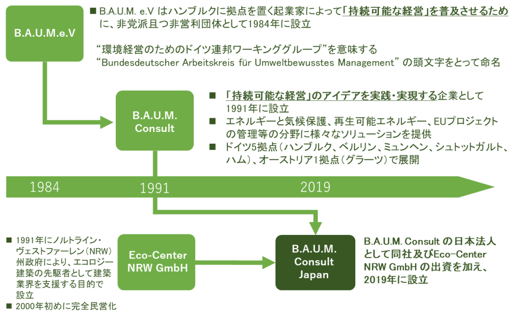 B.A.U.M. Consult Japan(バウムコンサルトジャパン)株式会社は、世界最先端のドイツの環境・エネルギー分野の取組を日本に紹介してきた、ドイツのソーシャルビジネスであるエコセンターNRW社とB.A.U.M. Consult社が出資し、日独合弁企業として設立されました。私たちは、両社の持つ経験と知見、国際ネットワークを日本に役立てていきます。