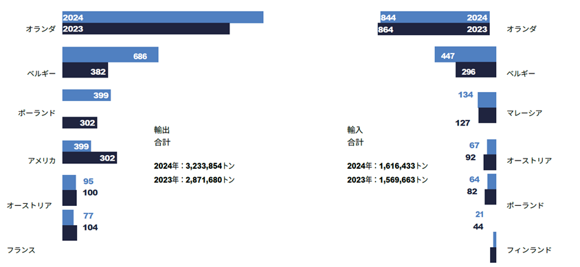 しかしながら、現時点でドイツではHVOは実は生産されておらず、EU諸国からの輸入に頼っている現状である(図2参照)。オランダへの輸出と輸入が最も多い。米国への輸出も見受けられる。輸入国としてマレーシアが表記されているが、EUDRの発効により、影響を受ける可能性が否めない。