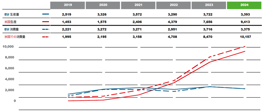 参考に、図4としてEU及び米国のHVOの生産量と消費量を示す。2021年まではEUの生産量及び消費量が米国よりも多かったが、米国の生産と消費が2022年にはEUの2倍となり、2024年直近では各5倍となっている。米国はHVO製造量が世界トップとなっており、ドイツの輸入元となる準備が出来ていると推察できるのはなかろうか。